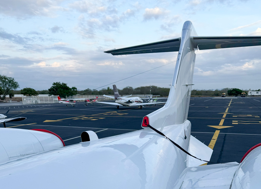 The Lear Models 40 & 45 Empennage Cover is a complete, one-piece cover which covers both the vertical and horizontal stabilizers, as well as the tailboom. It is normally made from Solution-Dyed Polyester or Acrylic Sunbrella The cover attaches with adjustable straps underneath the belly. The cover is pulled back over the vertical stabilizer and a plastic all-weather zipper is closed at the trailing edge of the rudder. The cover is then stretched over the elevators and zippered closed along the bottom outboard elevator surfaces. The covers cinch under the horizontal stabilizers using adjustable straps. All antennas, beacons and static wicks, if applicable, are accounted for in the design.... read more