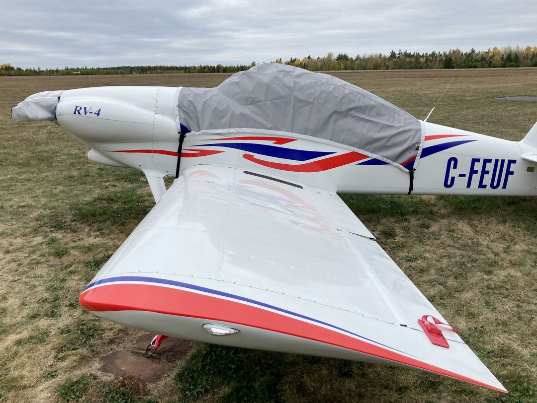 The Van's Aircraft RV-4 Wing Covers are a perfect solution to protect your paint from sun damage and prevent winter frost, snow, ice buildup, and corrosion. They are made from Solution-Dyed Polyester or Acrylic Sunbrella and form-fit to slip around each wing tip, cover the entire upper surface of the wing and wrap around the leading and trailing edges. The covers secure under the wing with adjustable straps from the trailing edge to the leading edge. The wing covers can also attach to each other with adjustable straps at the leading and trailing edges of the wing under the belly of the plane. In some instances, cut-outs are made in the trailing edge of the wing covers to accommodate static wicks. We have the ability to also accommodate wing tip modifications, such as STOL kits, droop tips, and vortex generators. Wing covers are labeled LEFT and RIGHT for your convenience. Wing Covers are available for winter use or long-term, all-year use. A Hail Protection version can be made which incorporates very dense closed cell foam into the entire upper surface of the wing covers to help prevent hail damage. Although these covers are bulky, they do help protect your wing and control surfaces against small to medium-size hail.... read more