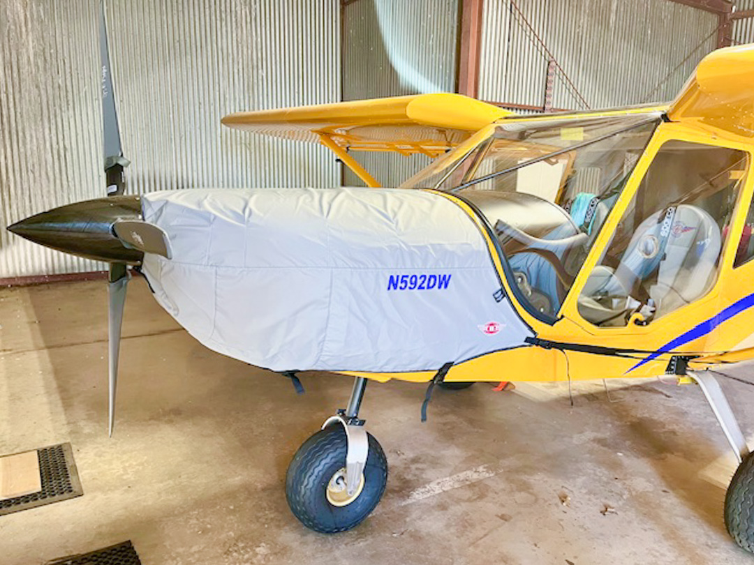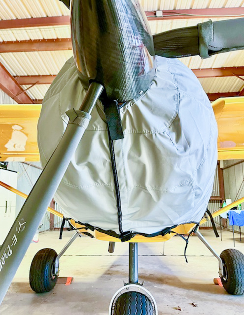 Engine Covers will cinch around or behind the spinner, cover the entire engine cowl area including the engine air cooling and induction air inlets, and fastens together with Velcro beneath the spinner down the front of the cowling. The Engine Cover is attached with a belly strap aft of the firewall, and can Velcro to the Canopy Cover. Engine Covers are normally made from Solution-Dyed Polyester or Acrylic Sunbrella. An Insulated version of the engine cover can be made with a thicker, quilted, and water-repellent material. The Insulated Engine Cover works well in cold climates to help with engine preheating.... read more